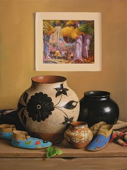 Residing in Taos, New Mexico, Acheff brings to his art a background rich with influences of his Georgian and Athabascan Indian heritage. His work is noted for an incorporation of Native American pottery, drums, blankets, fetishes and other arrangements of Southwestern memorabilia and relics. |